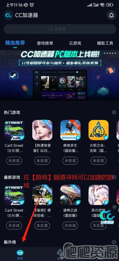 3、在【游戏频道】查看可以加速的游戏,如果不支持那是无法进行加速的;