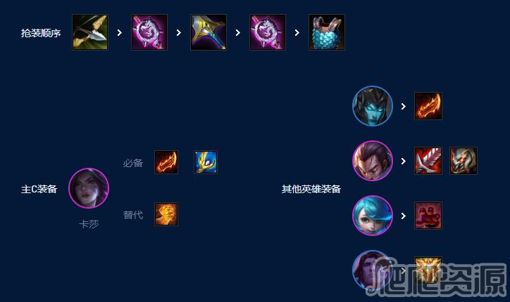 主C4个,辅助3个,3保4装备不够分,所以得均匀培养。亚索饮血泰坦,滑板鞋一把羊刀不3不要给第23件,宝石1个鸟盾就够了,装备不够做第二个,这仨是第一优先级。其次卡莎、格温捡垃圾做法伤装,最好是有偷偷,偷偷配珠光是绝配。卡莎最好有豪华的装备来保证阵容在前15秒内打出减员或者压血线,帮助滑板鞋过第一个前排。