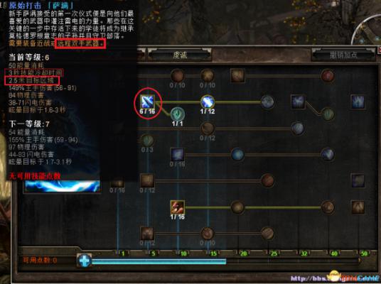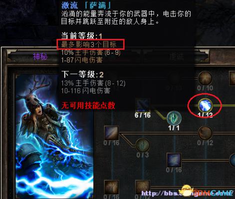 接下来是被动技能“激流” 闪电链效果就是点了这个被动来的,能在范围的基础上,再进行弹跳(闪电链)攻击: