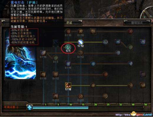 最后是光环技能,这个是萨满的终极技能,要50基础点数才能学,叫“风暴召唤者的契约”。 如果你不喜欢闪电,你可以学“原始羁绊”来堆物理伤害。