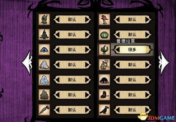 这里给大家看一下张图,首先大家在开始游戏的时候设置一下世界,把世界里面的资源调一下,大家把曼德拉草调成很多,进图你就可以看见很多曼德拉草了,就可以开始捡曼德拉草,捡够128个曼德拉草后,把它们全部烤一下,然后利用吃曼德拉草的特性睡觉就可以轻松度过128天,也就可以轻松解锁上面的9个人物了。