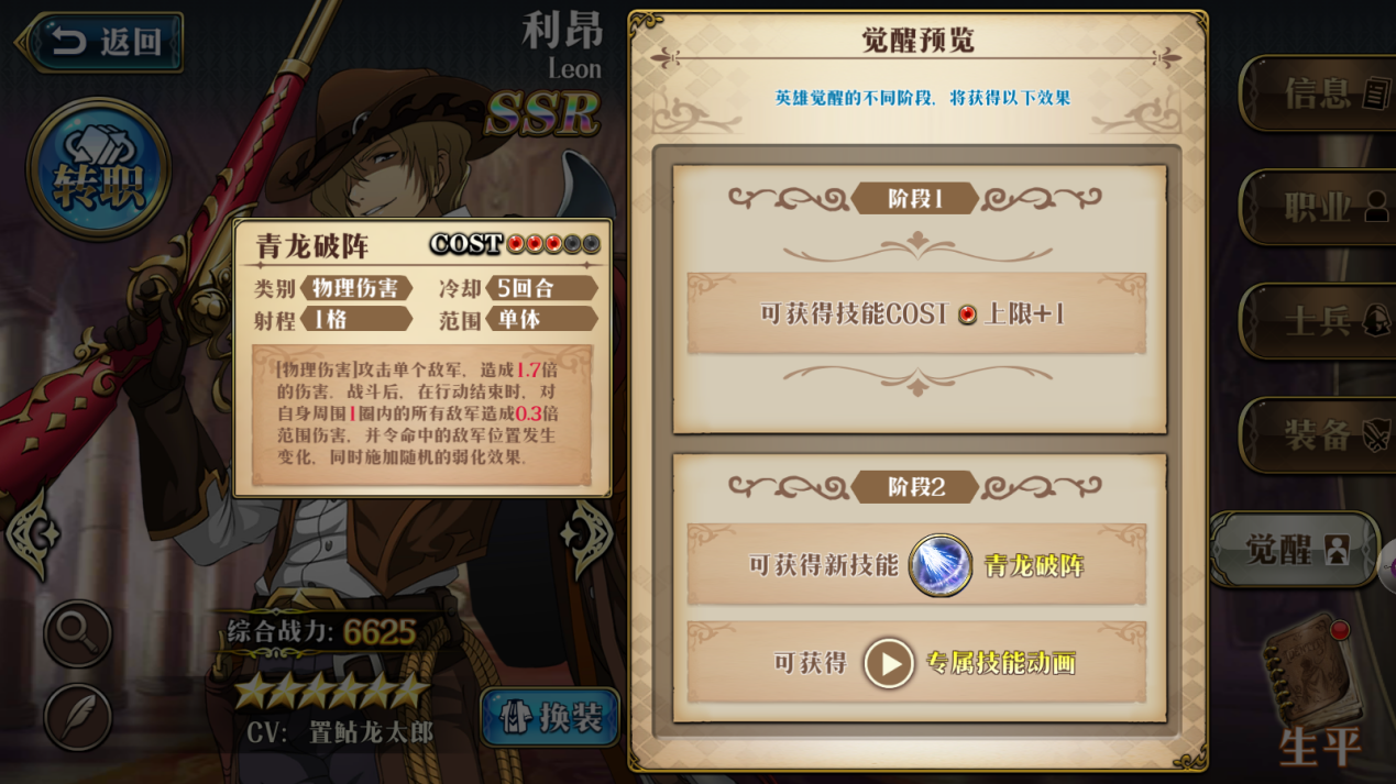 首先,让我们来看一下"青龙之胄"的属性。满星后提升10%的防御加成,当利昂在受到伤害后,获得移动不受地形限制的效果,持续1个回合。防御的提升增加了利昂的生存能力,而移动不受地形限制的特点,这有点继承了元帅超绝的味道。这件装备的特点就是:只要是利昂受到伤害,就拥有在移动时如履平地的效果,算是成为一个真正独立的英雄。