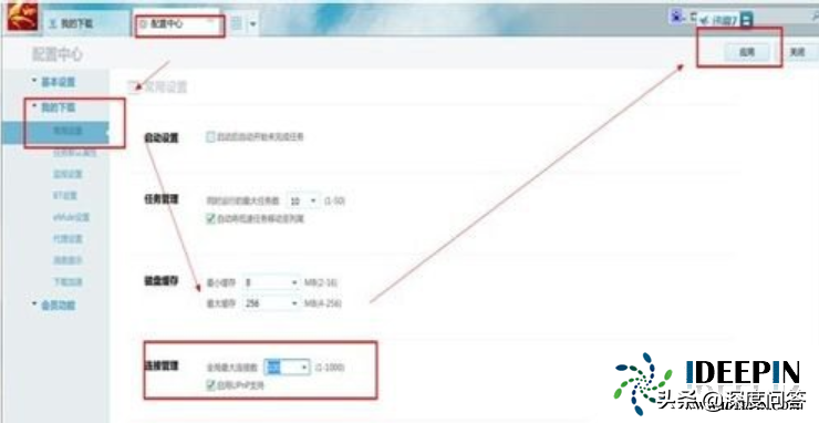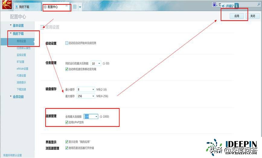 连接数修改方式:打开迅雷7内的配置中心-左侧我的下载-常用设置里进行修改,然后右下应用,具体如下图。